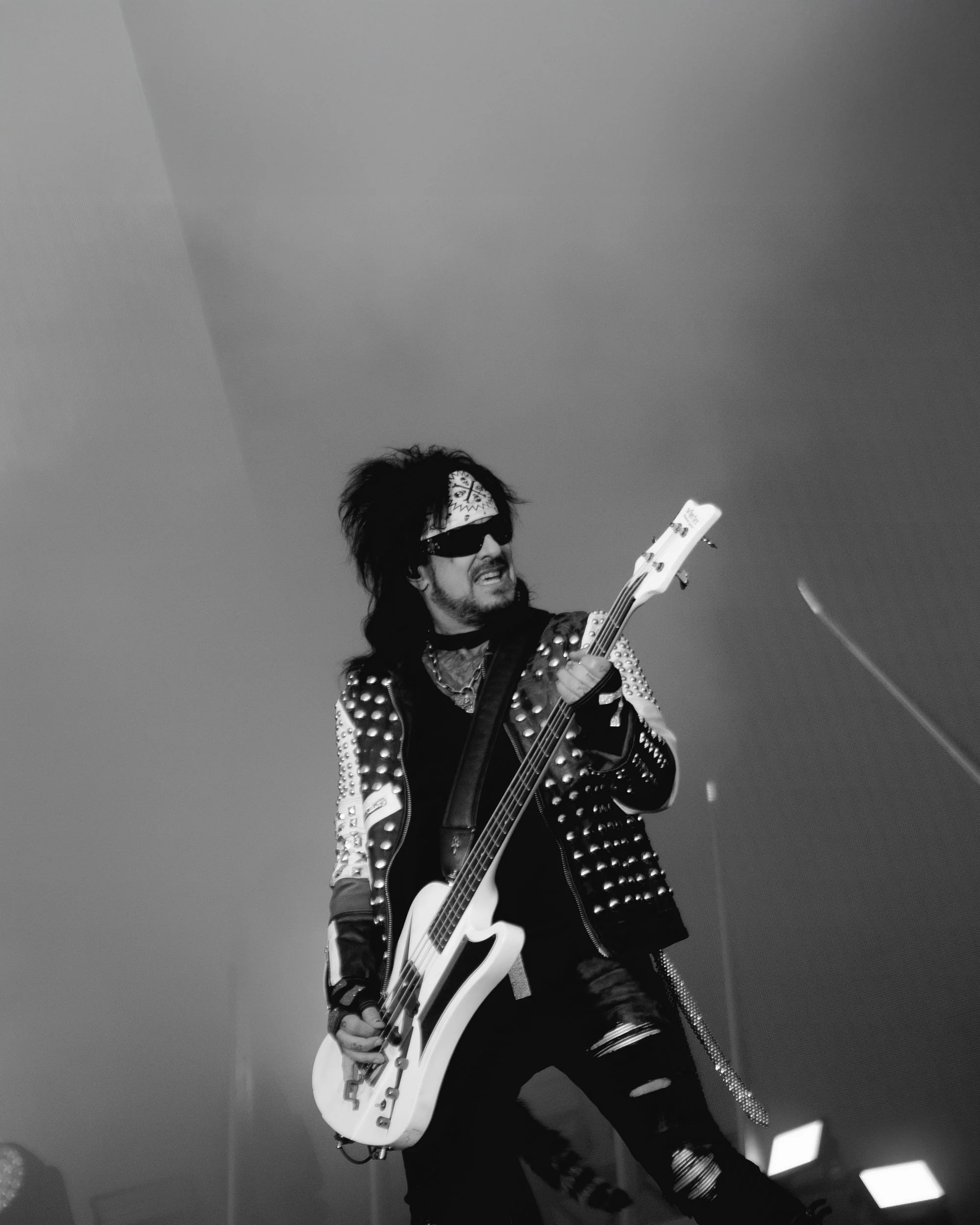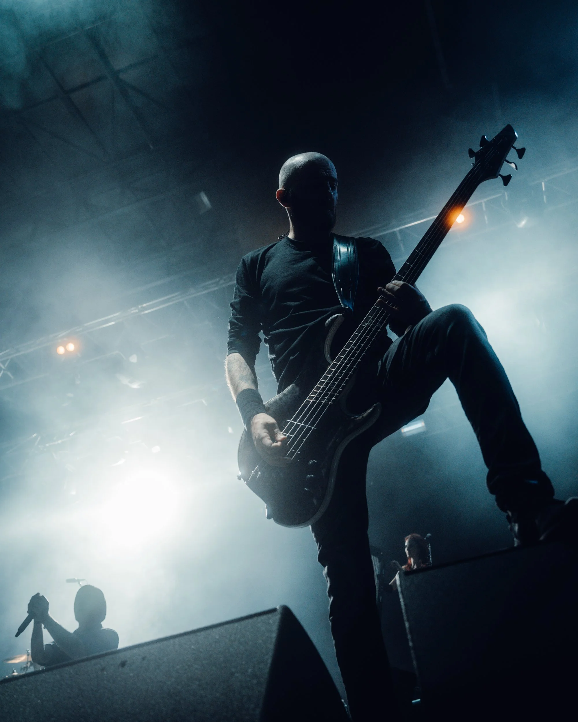 Ein Musiker spielt auf einer Bassgitarre auf einer Bühne bei einem Konzert, im Hintergrund sind weitere Musiker und Bühnenlichter zu sehen, das Licht ist dramatisch und dunkel.