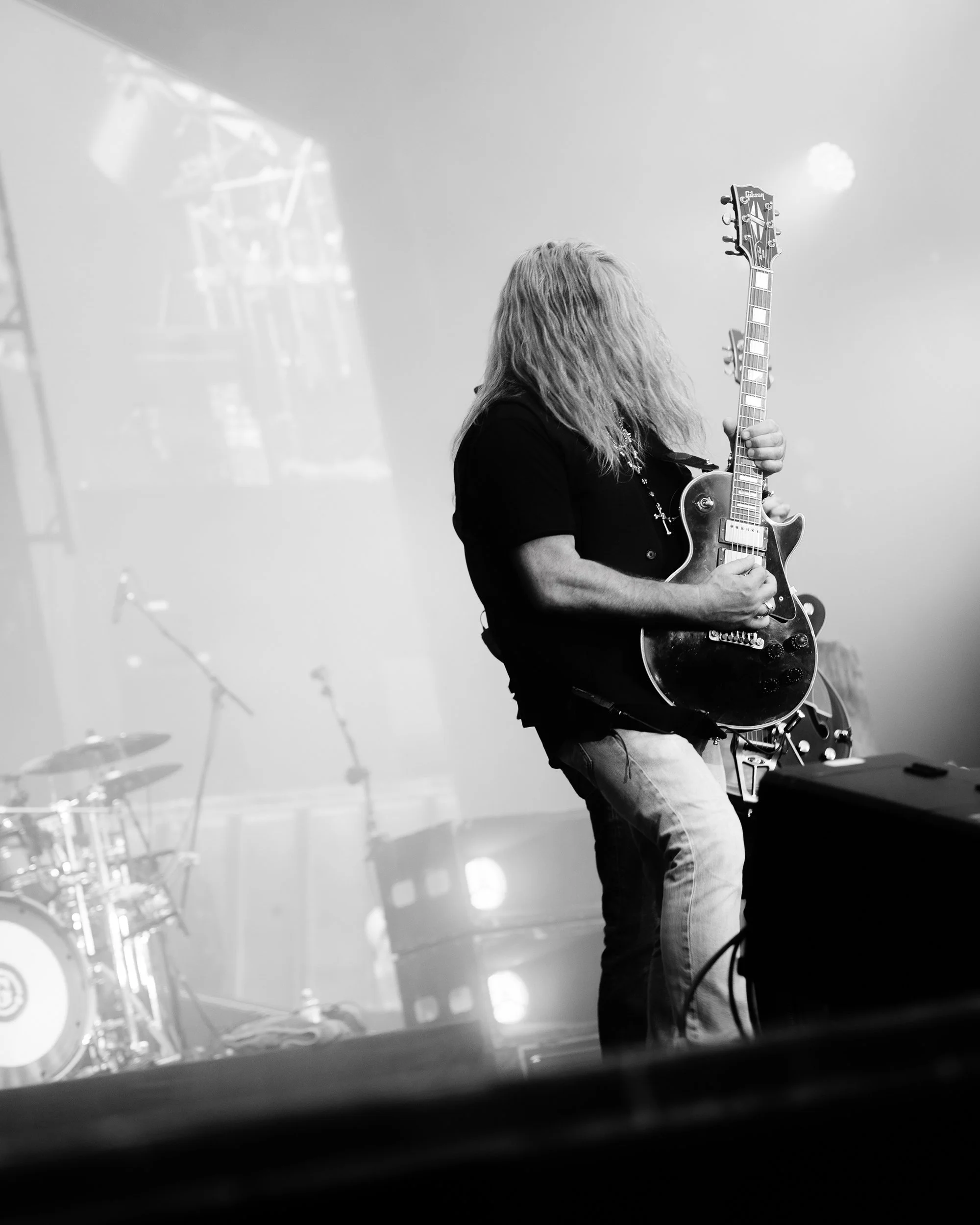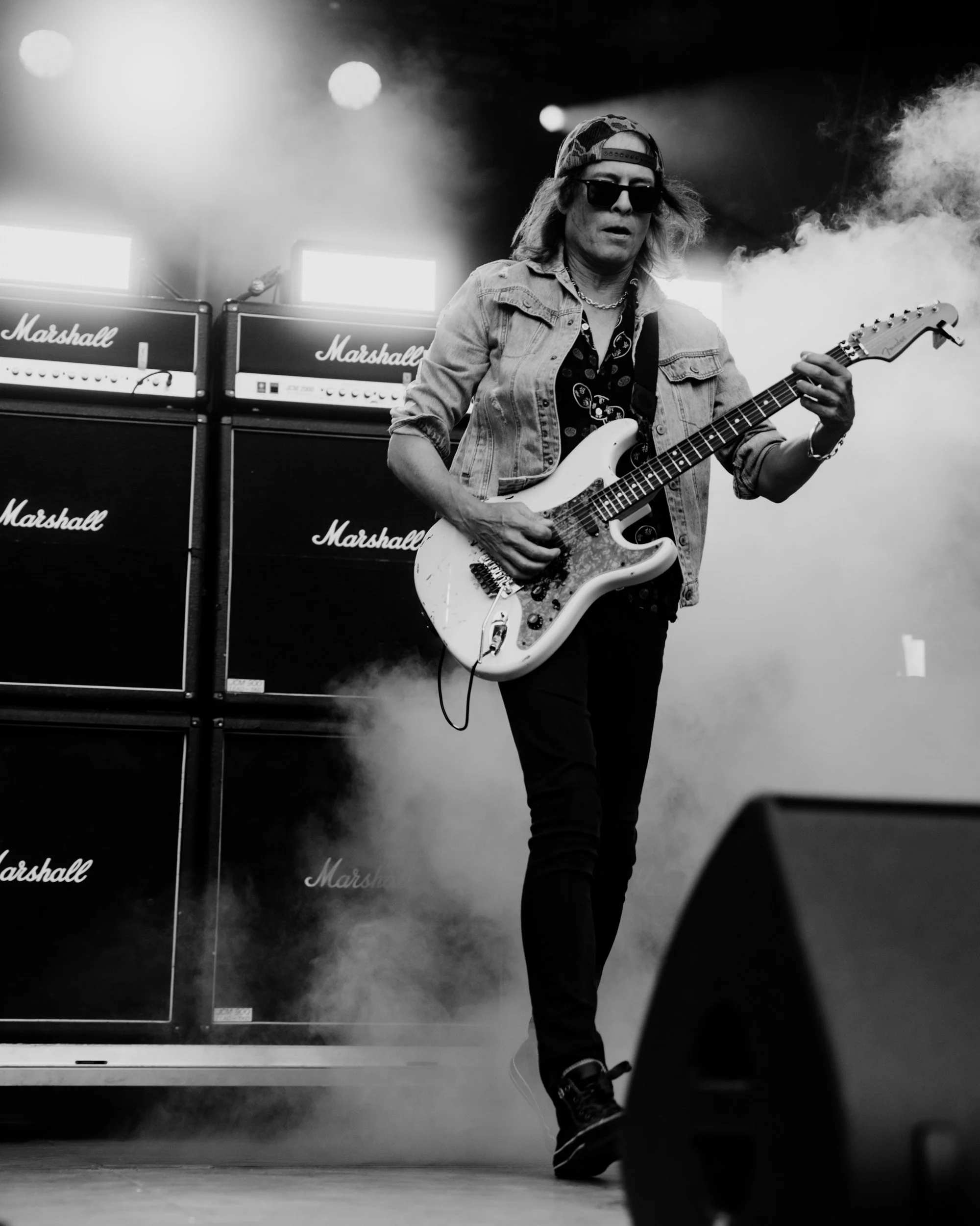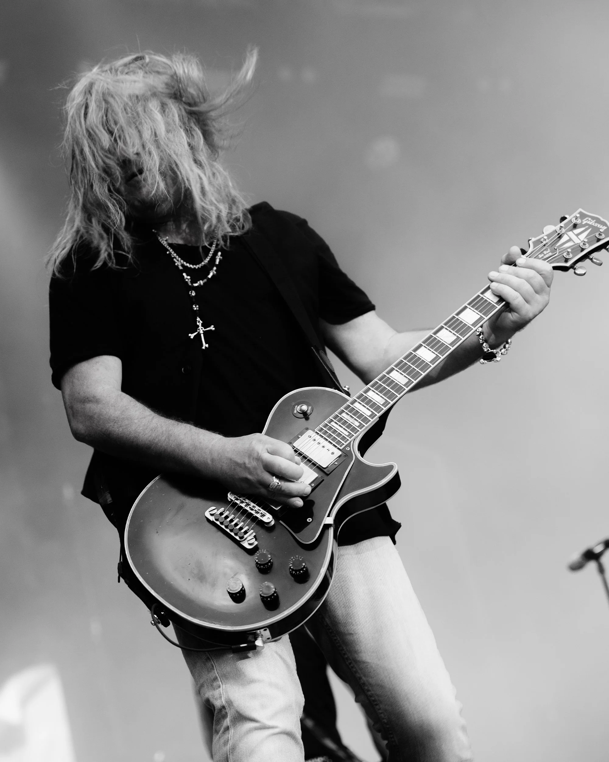 Ein Musiker spielt eine elektrische Gitarre auf einer Bühne, mit langem, wildem Haar, schwarzen Kleidung und Schmuck, im Schwarz-Weiß-Foto.