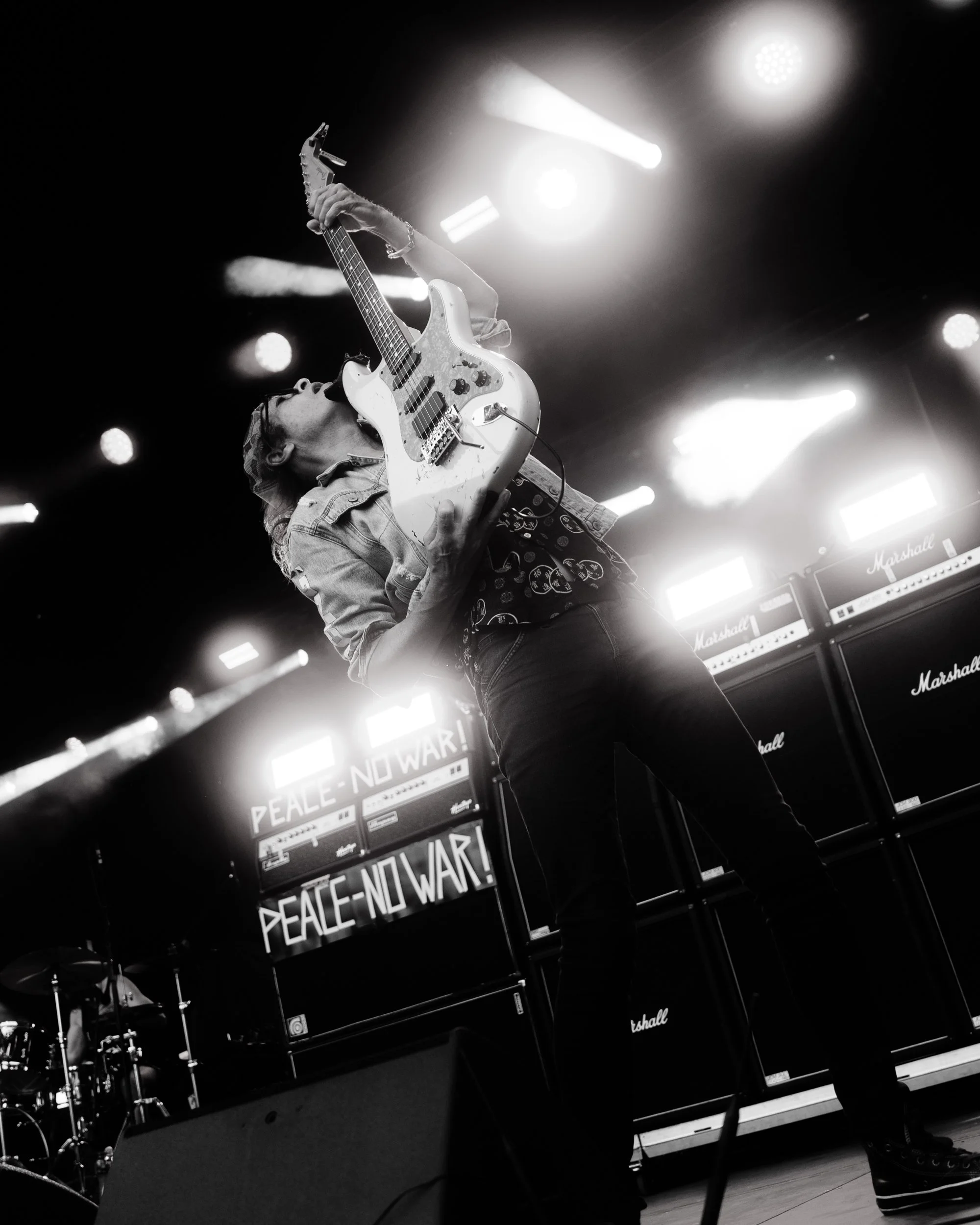 Ein Rockstar mit E-Gitarre auf der Bühne bei einem Konzert, im Hintergrund leuchtende Lichter und Lautsprecher, die Aufschrift "PEACE-NO WAR!" auf einem Bildschirm.