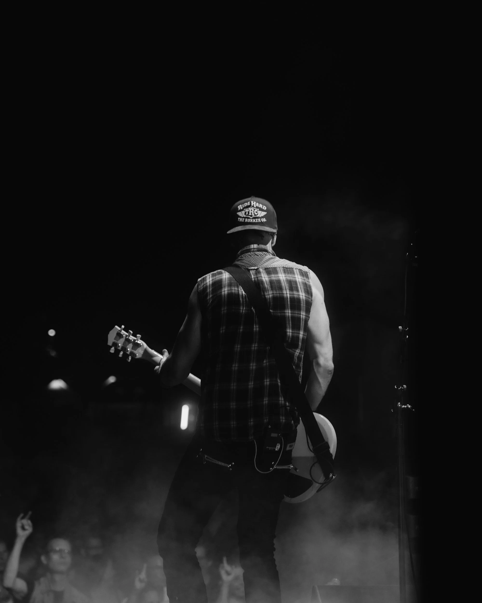 Ein Musiker spielt Gitarre auf einer Bühne bei einem Konzert, im Hintergrund ist das Publikum zu sehen.