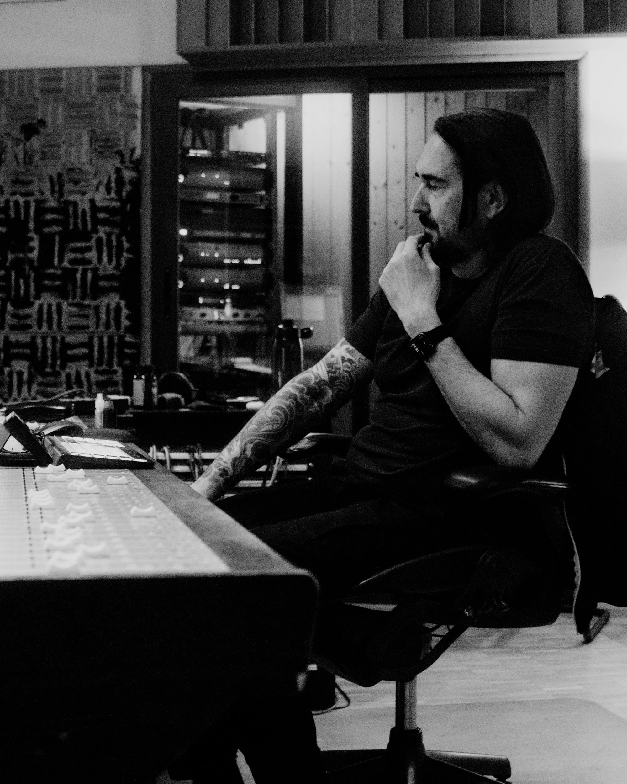 Mann mit Tattoo am Arm sitzt in einem Tonstudio vor einem Mischpult, in einer monochromen Schwarz-Weiß-Aufnahme.