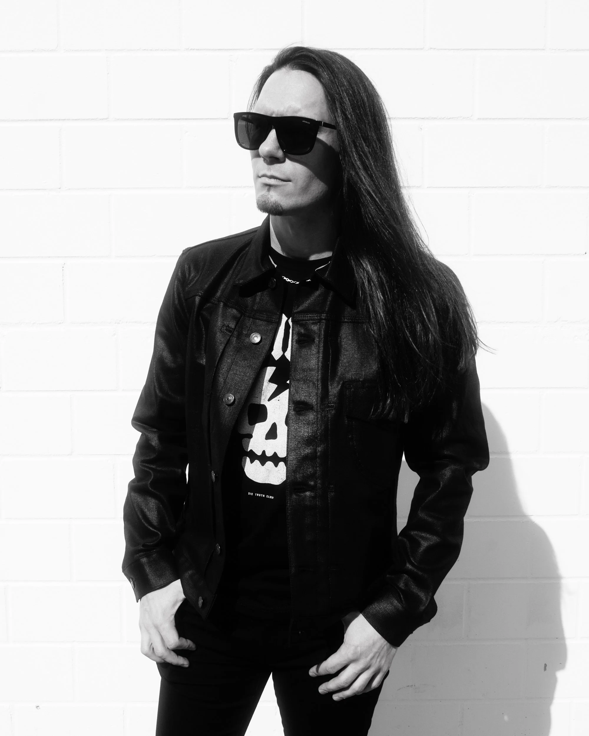 Schwarzer Mann mit Sonnenbrille, langem Haar, Lederjacke und T-Shirt mit Totenkopf-Design vor weißer Ziegelwand