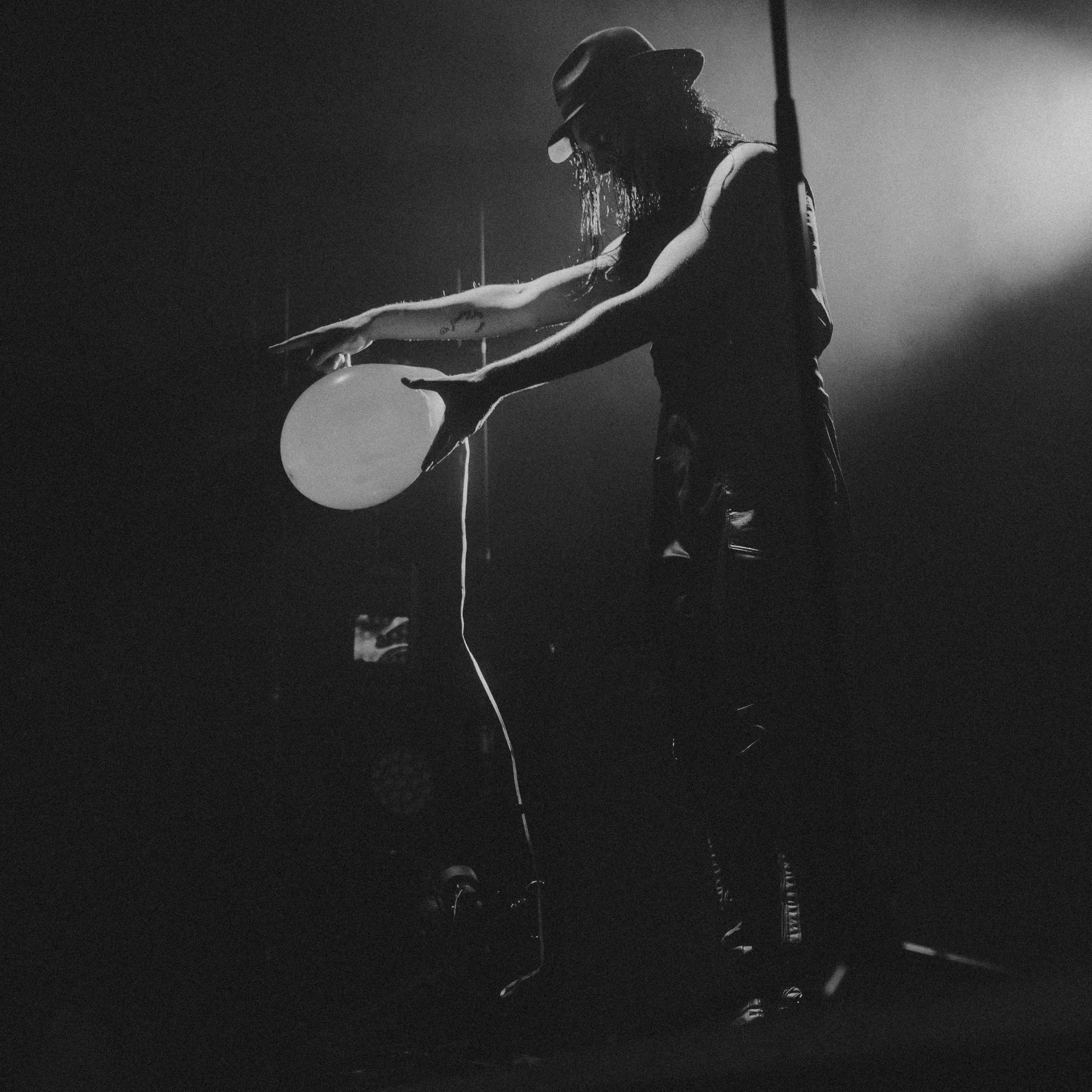 Eine Person mit Hut und nassem Haar, die einen Ballon in der Hand hält, bei Dunkelheit inszeniert, in Schwarzweißfotografie
