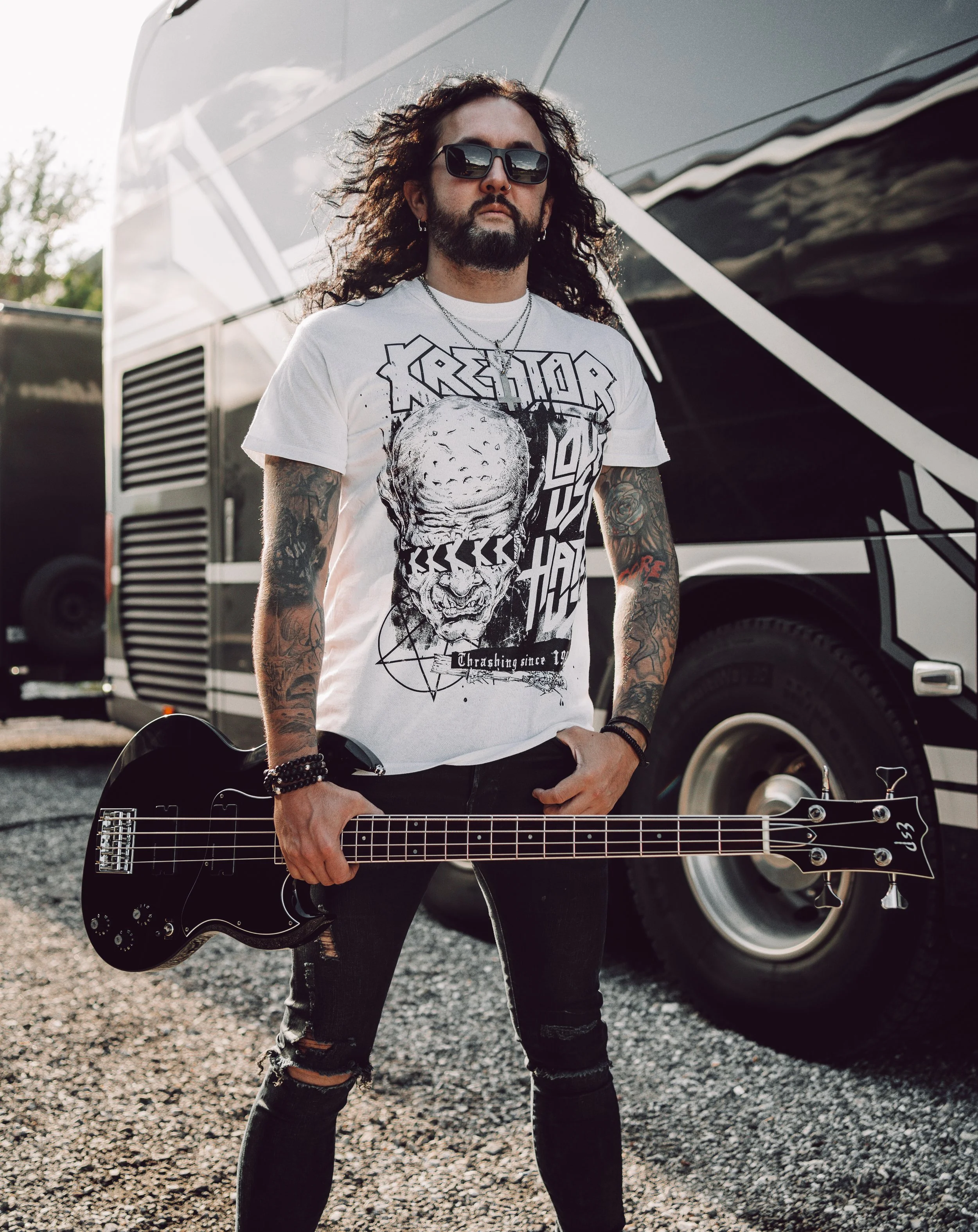Mann mit langen Haaren, Sonnenbrille und Tätowierungen steht mit E-Gitarre vor einem großen Reisebus im Freien.