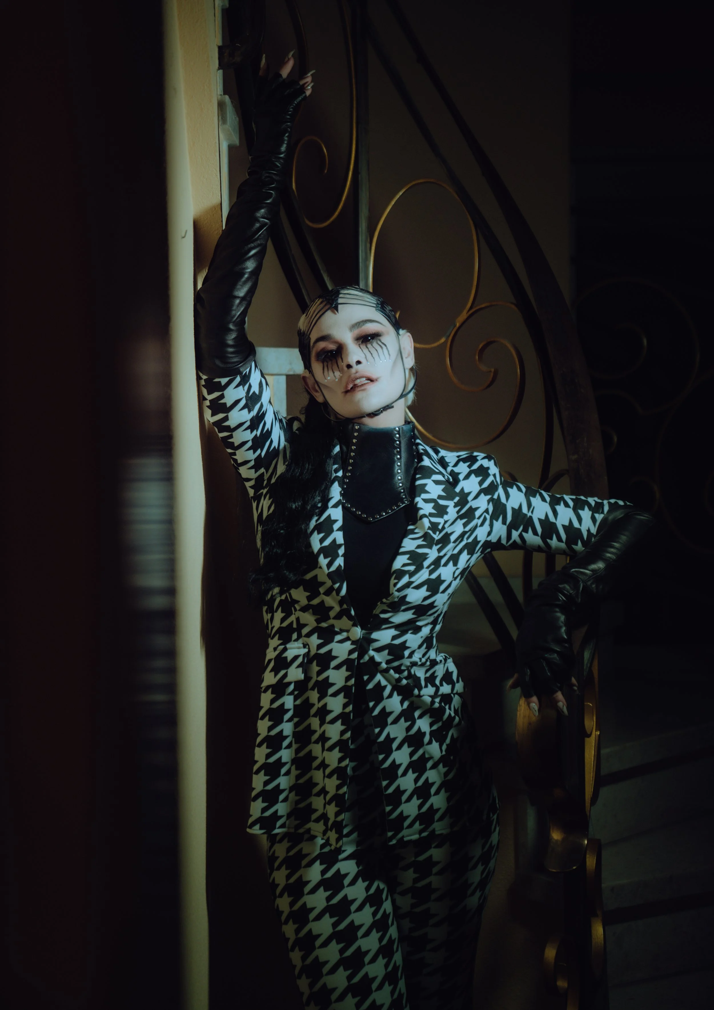 Frau in schwarz-weiß Hahnentritt-Anzug, mit dunklem Lippenstift und dramatischem Make-up, lehnt an einem Treppengeländer in einem dunklen Raum.