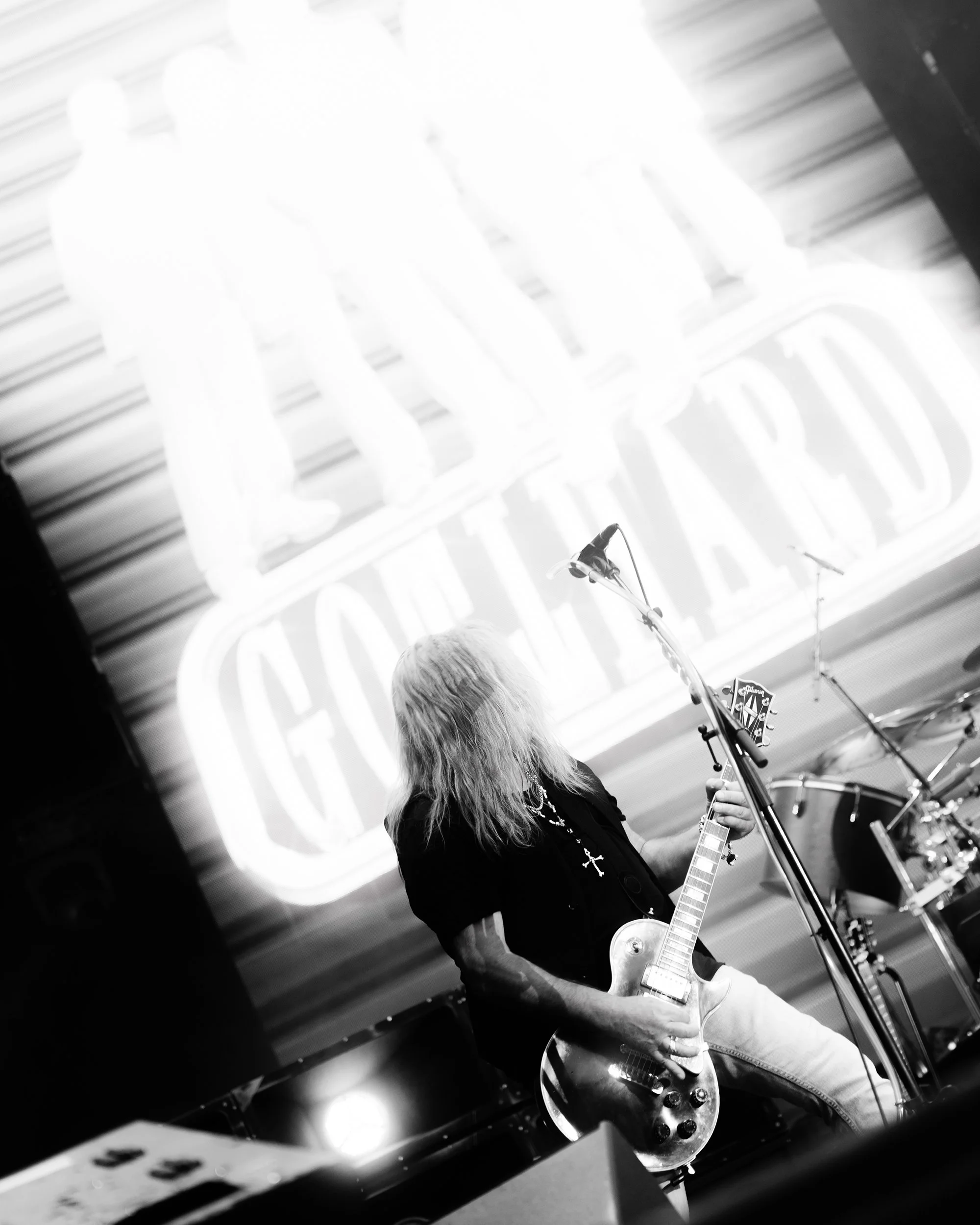 Ein Musiker mit langen Haaren spielt auf einer E-Gitarre bei einem Konzert, im Hintergrund ein Schlagzeug. Das Bild ist schwarz-weiß.