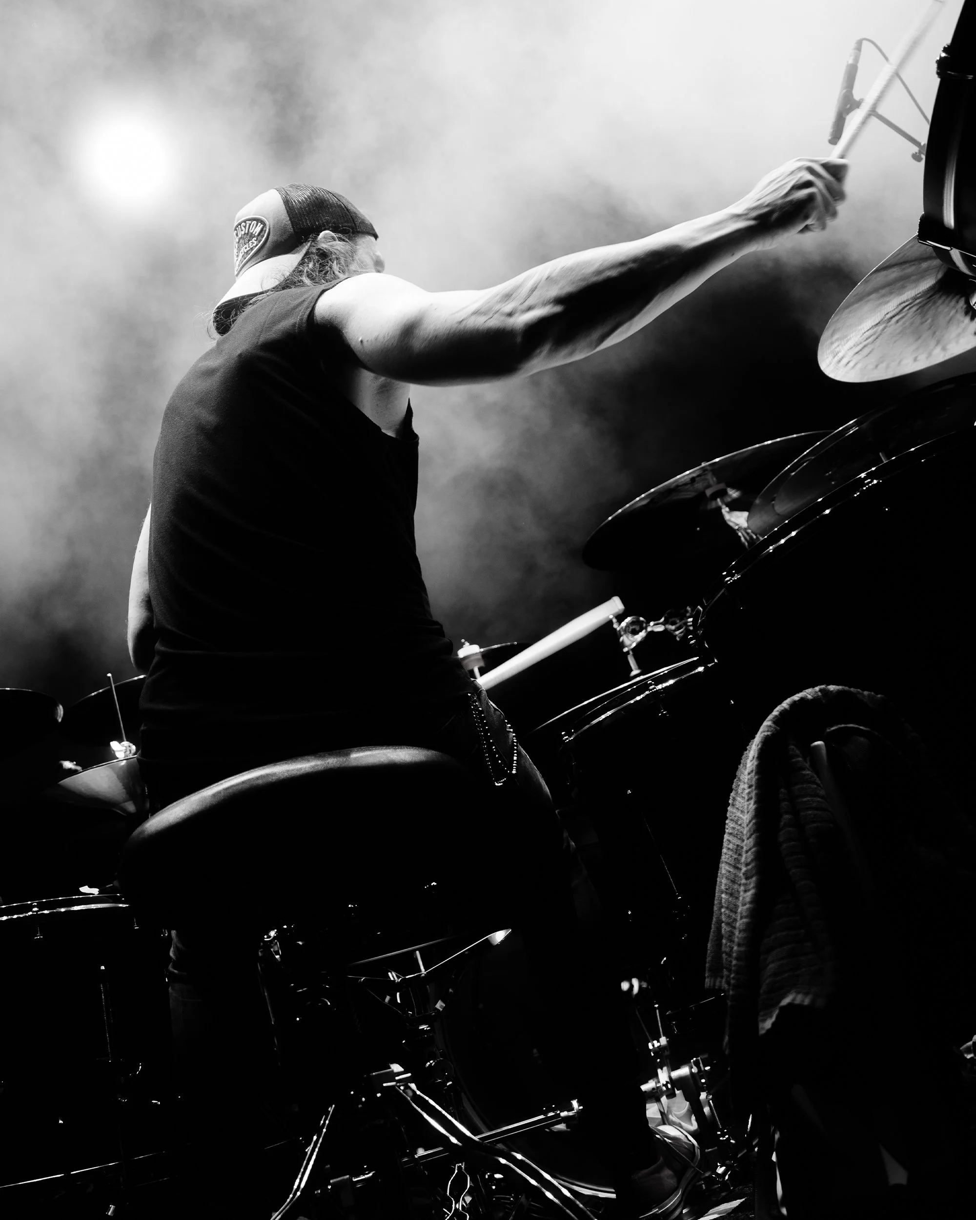 Schwarz-Weiß-Foto eines Schlagzeugers auf einer Bühne bei einem Auftritt.